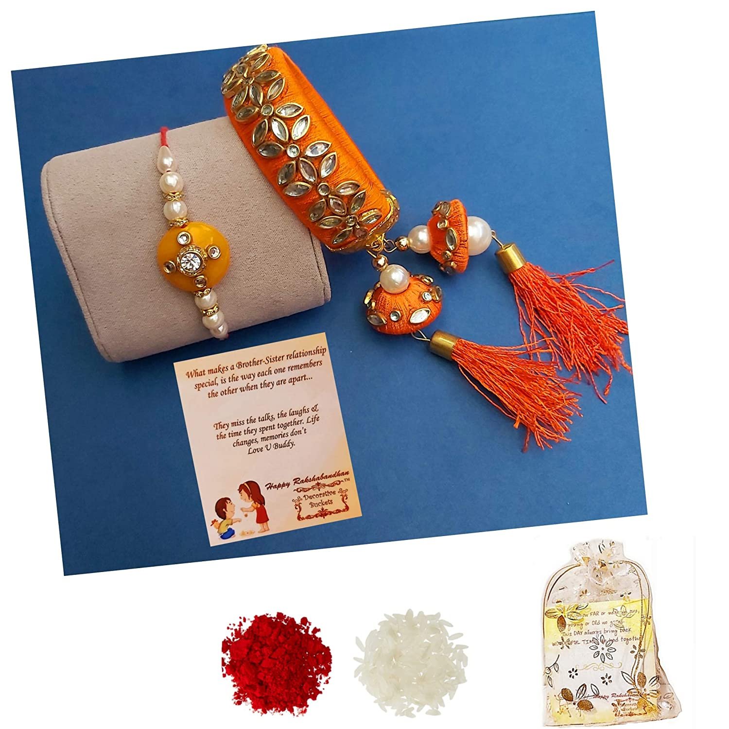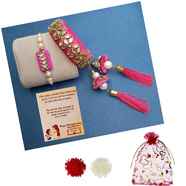 Package Contains: 1 Bhaiya bhabhi(Lumba) Rakhi set, 1 potli ,1 message card 1 Roli bottle & 1 chawal(rice) bottle”