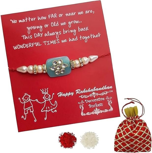 - BEAUTIFUL PACKAGING : RAKHI COMBO INCLUDES:1 RAKHI ,1 MESSAGE GREETING CARD ,1 ROLI PACKET, 1 CHAWAL., 1 POTLI