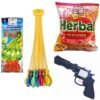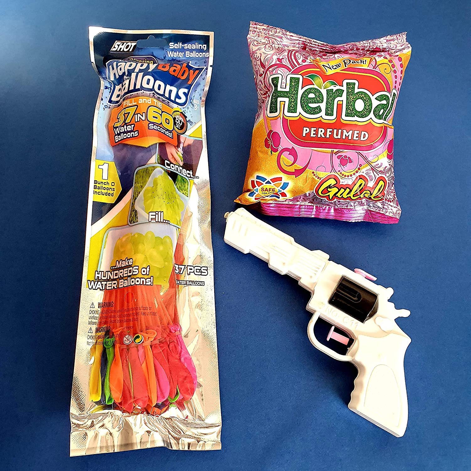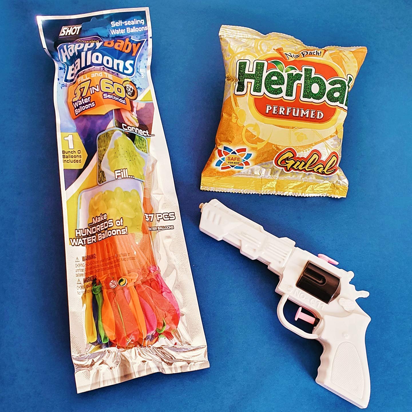 “DECORATIVE BUCKETS COMPLETE HOLI CELEBRATION COMBO OF 3: 1 holi water balloons ,1 holi color pack & 1 mini holi pichkari.