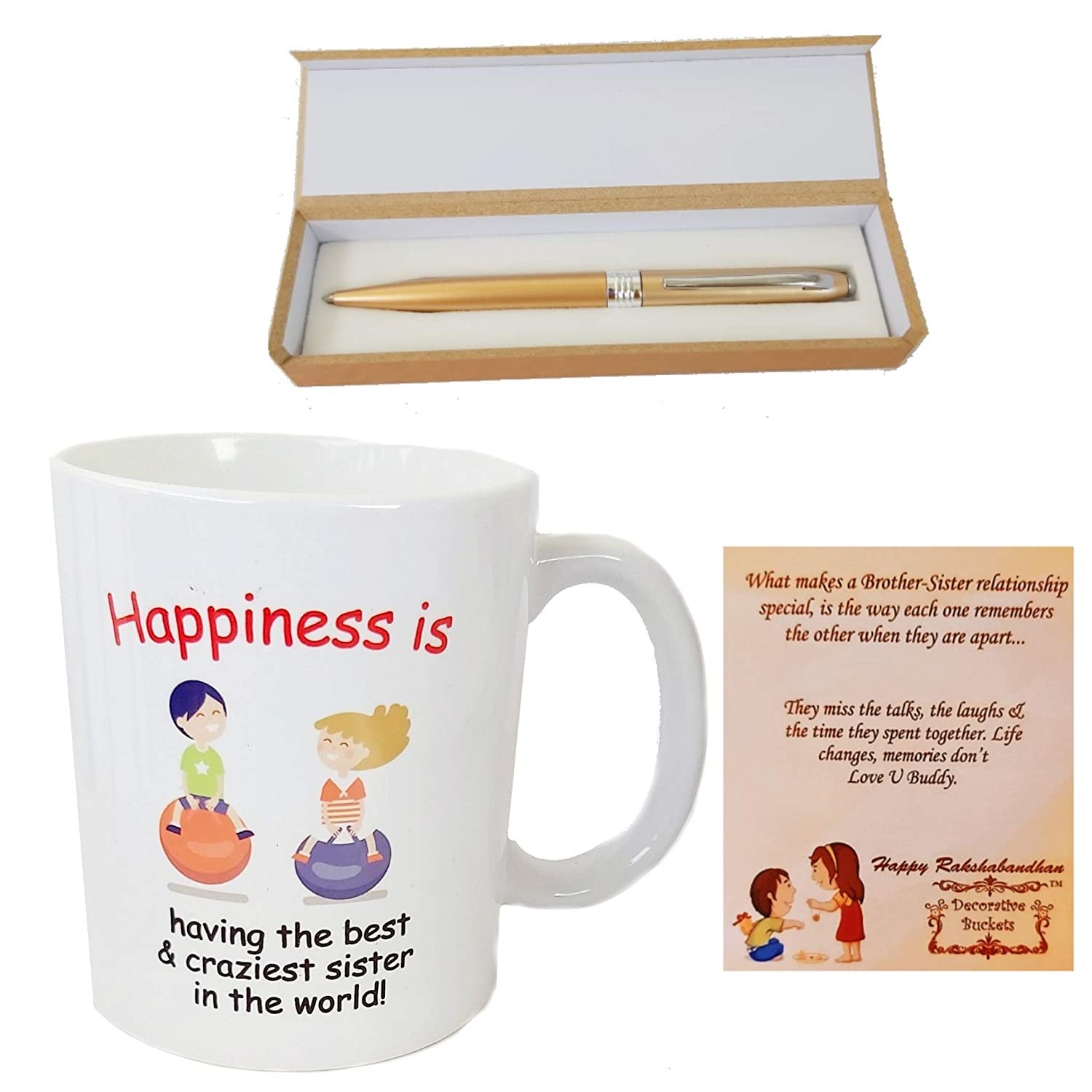 “Decorative Buckets rakhi gift for sister |rakshabandhan gifts for sister| RAKHI GIFT COMBO 1 Mug 1 PEN WITH WOODEN BOX & 1 greeting card