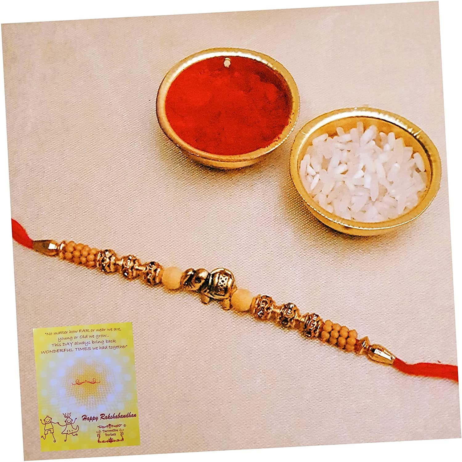 • All These traditional moli rakhis like ganesh rakhi, tortoise rakhi , elephant rakhi, om rakhi brings joy and happiness to the festival. Material metal and wood