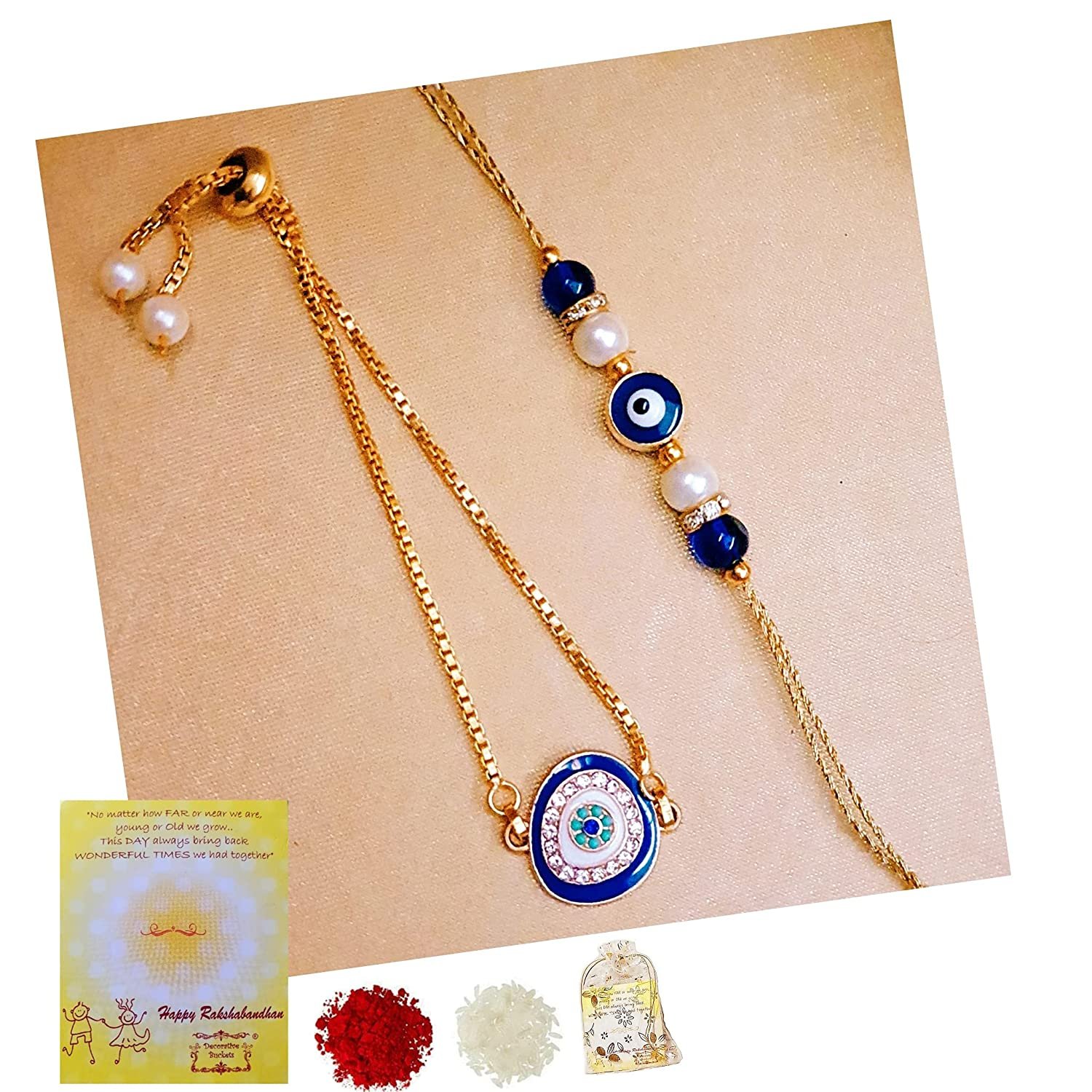 - The evil eye Rakhis and evil eye bracelets are believed to eliminate negative energies and ward off the evil and envy forces.