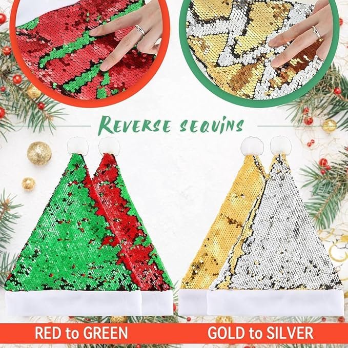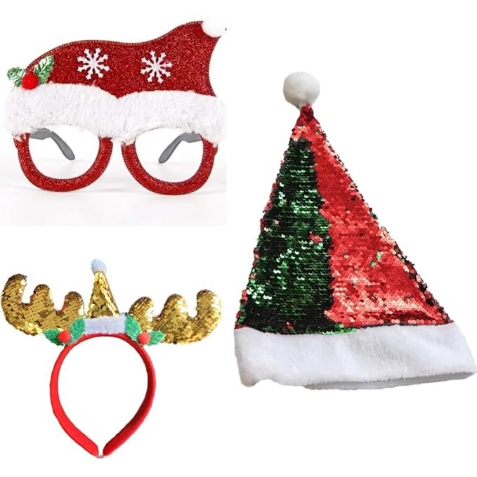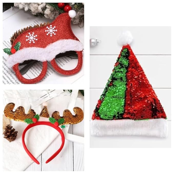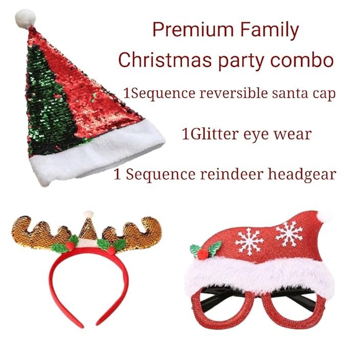 - Set of 3 christmas party prop : CHRISTMAS PARTY FAMILY COMBO of 3 : 1 sequence reversible santa cap, 1 sequence reindeer hair band & 1 santa clause eyewear.