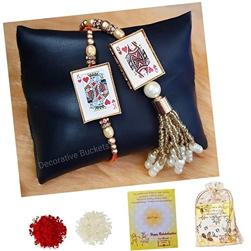 Package Contains: 1 Bhaiya bhabhi(Lumba) Rakhi set, 1 potli ,1 message card 1 Roli bottle & 1 chawal(rice) pack”