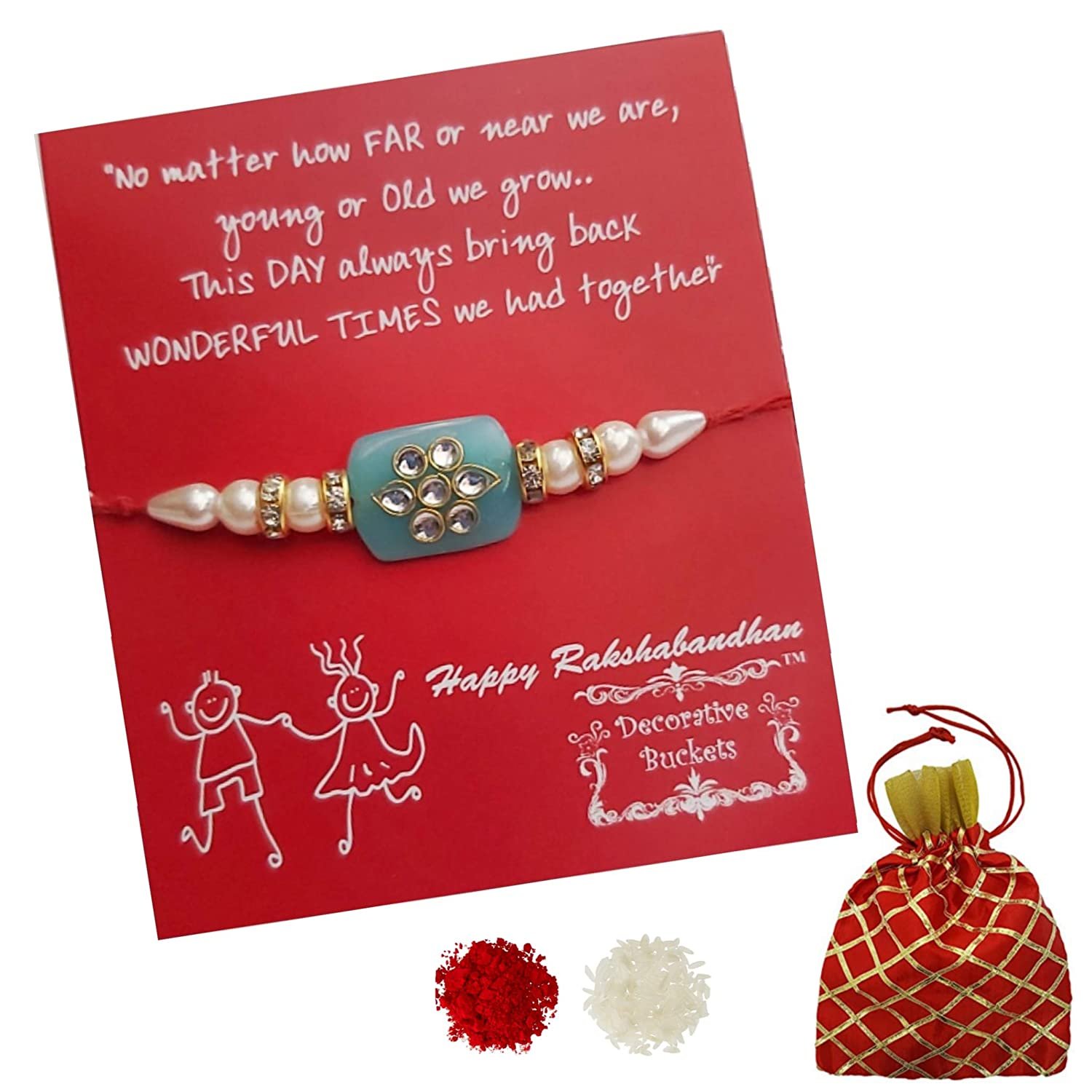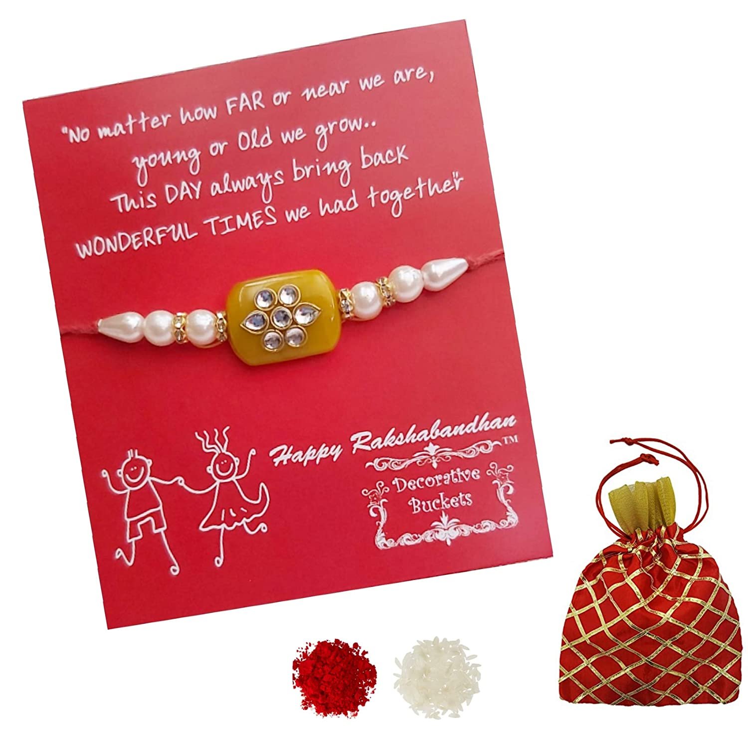 PACKAGE CANTAINS : 1 RAKHI + 1 GREETING CARD +1 POTLI BAG + 1 ROLI BOX +1 RICE BOX .PS cushion shown in image is only to display not included in pack as rakhi comes in potli.)”