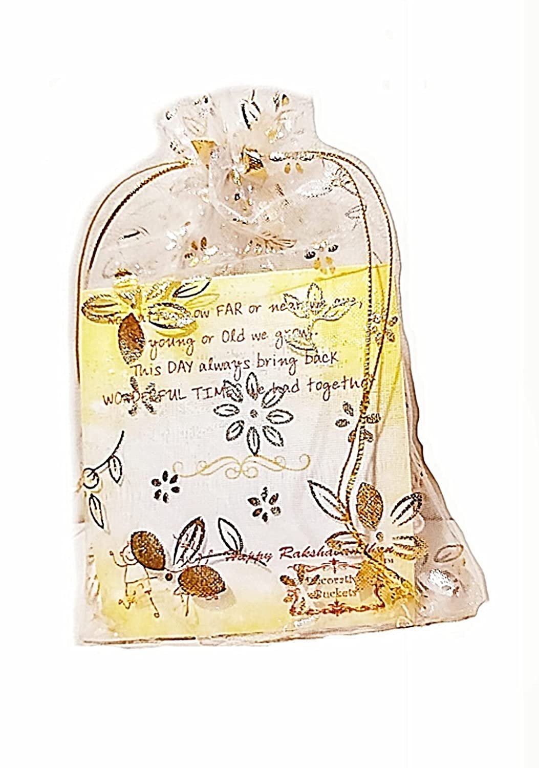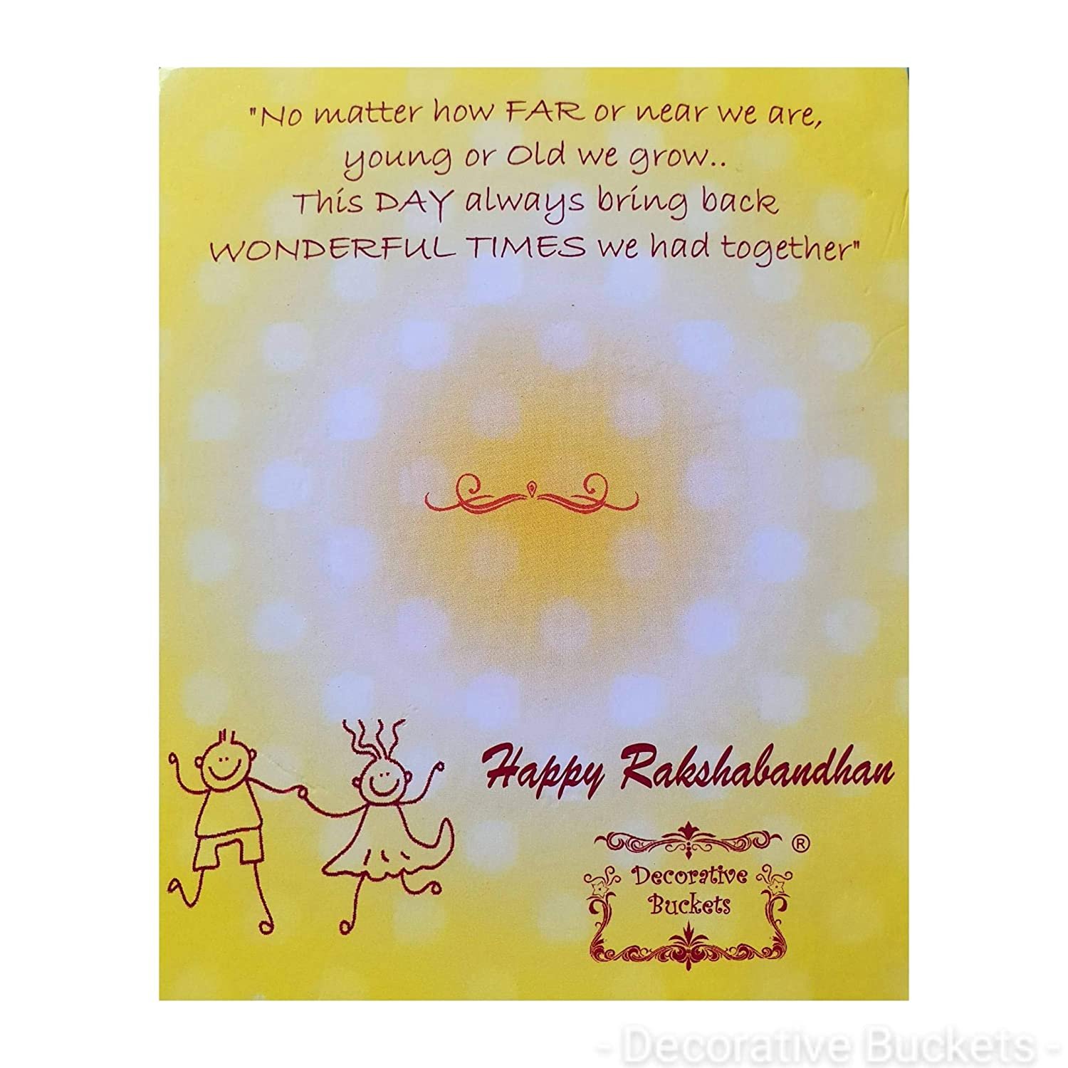 - Package Contains: 1 Bhaiya bhabhi(Lumba) Rakhi set, 1 potli ,1 message card 1 Roli bottle & 1 chawal(rice) pack