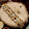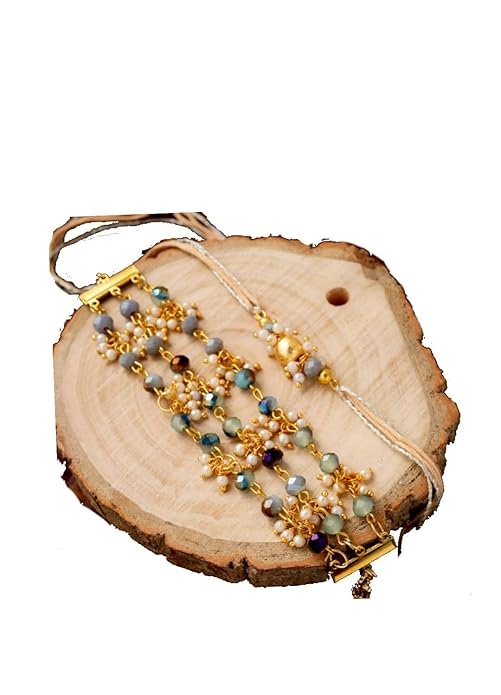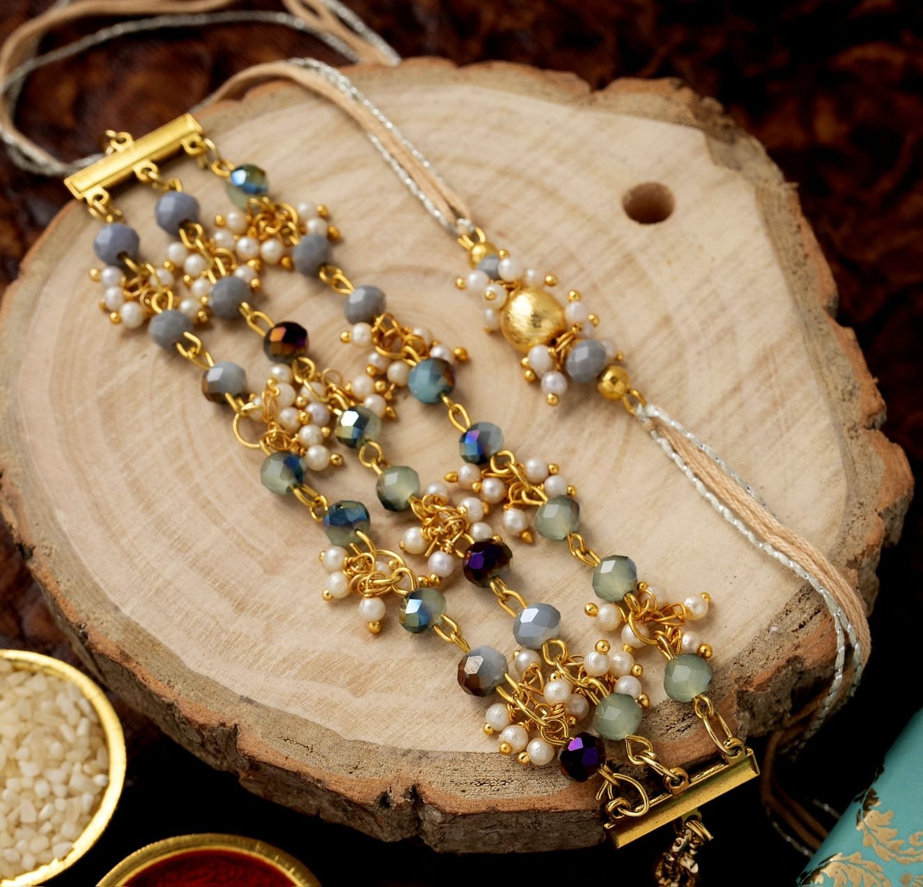 • Rakhi for brother and bhabhi | rakhi for bhaiya bhabhi | rakhi for brother and bhabhi combo |Meenakari rakhi | pearl rakhi | stone rakhi | mauli rakhi | rakshabandhan gifts | lotus rakhi | peacock rakhi| Rakhi for Brother and Bhabhi Combo Set of 2 with Designer Kundan Pearls Lumba Bracelet for Bhabhi with Printed Potli bag and Greeting Card