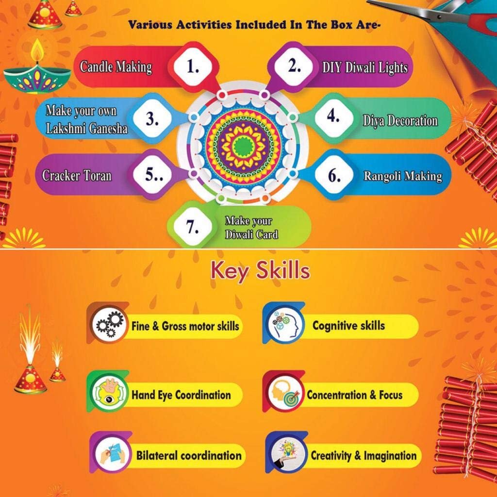 - This box includes 7 highly engaging DIY activities, which will not only enhance the learning side of the child but also arouse his/ her artistic abilities. The activities included in the box are – Candle Making, DIY Diwali Lights, Make your own Lakshmi Ganesha, Diya Decoration, Crackers Toran, Rangoli Making and Make your Diwali Card.