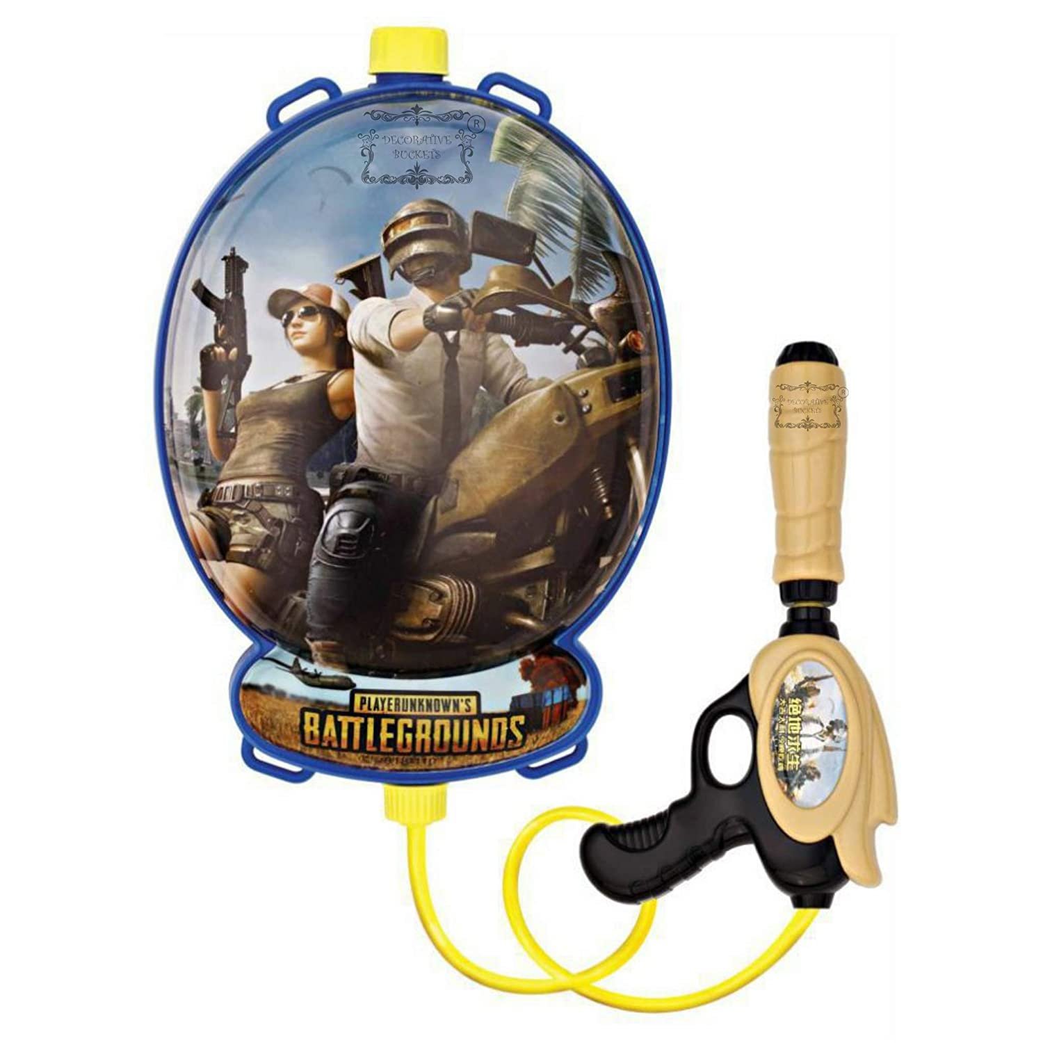 “A colourful water pichkari with easy to carry water storage tank as a backpack.Adjustable straps of the backpack makes it easy to fit to children as per their needs. The pressure pump water pichkari esnures the throw of water with a splash.