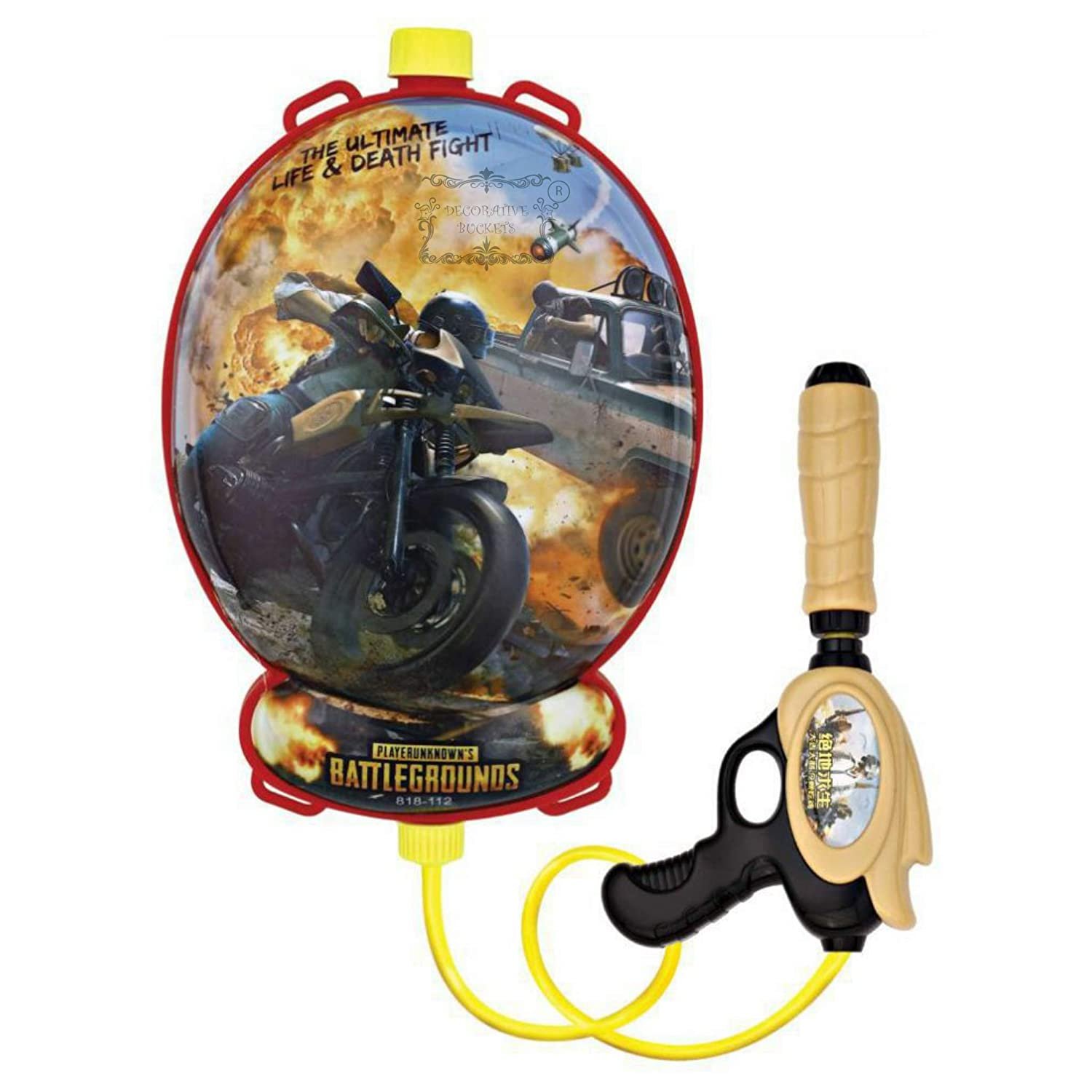 combo includes : PUBG water gun with FREE HOLI MESSAGE CARD. It has 1.5 lt guitar shape tank and a pressure gun .The gun works with pressure technology, just pull the half part of the gun back and forth to create pressure