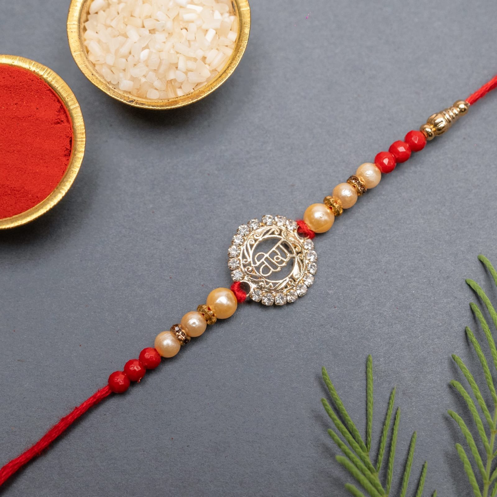 - MATERIAL : ANTIQUE METAL, PRODUCT AS SHOWN IN IMAGE. COLOR CAN BE RANDOM All These traditional mauli rakhi , kundan rakhi , pearl om rakhi brings joy and happiness to the festival. Material metal, Stone and kundan