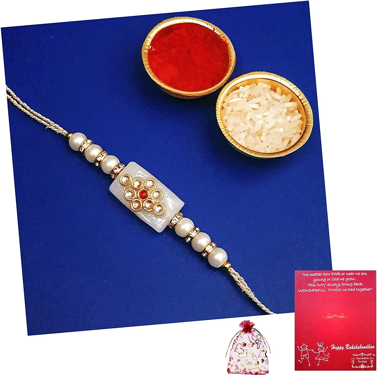 • PACKAGE CANTAINS : 1 RAKHI + 1 GREETING CARD +1 POTLI BAG + 1 ROLI BOX +1 RICE BOX .PS cushion shown in image is only to display not included in pack as rakhi comes in potli.)